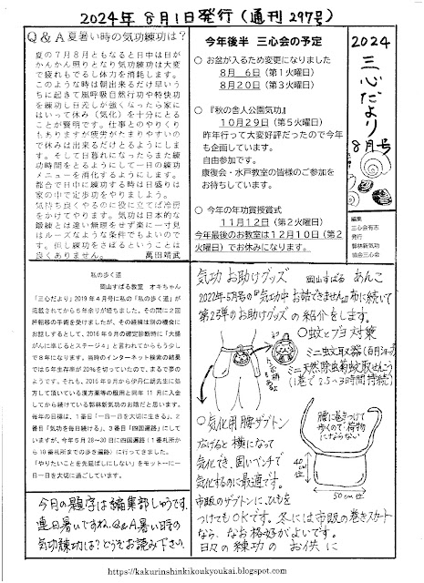 大変遅くなりましたが、 三心だより2024年8月号をお届けします。 下の画像をクリックすると、画像が開きます。この画像の上でクリックすると拡大表示されます。再度、クリックすると元のサイズに戻ります。 また、画像を開いた状態で、キーボードのCtrlキーを押しながら、マウスのスクロ...